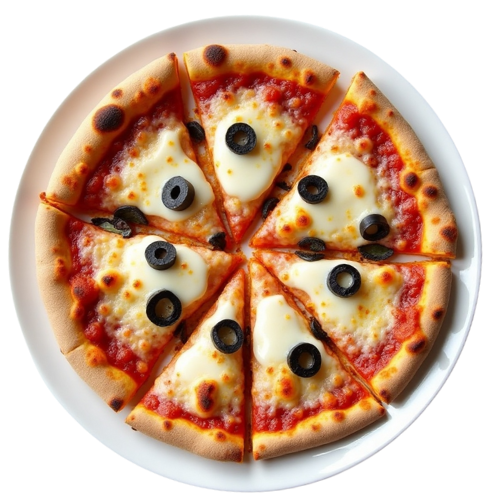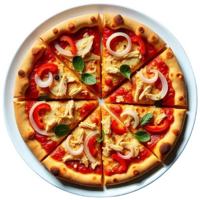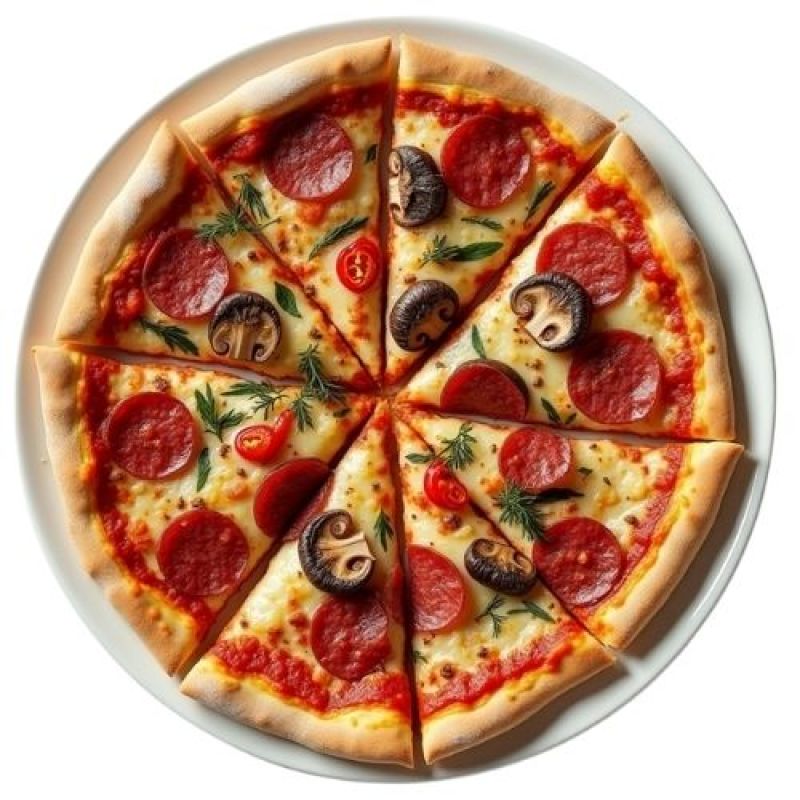 tomatensaus, kaas, champignons, paprika, ham (kalkoen) en salami
