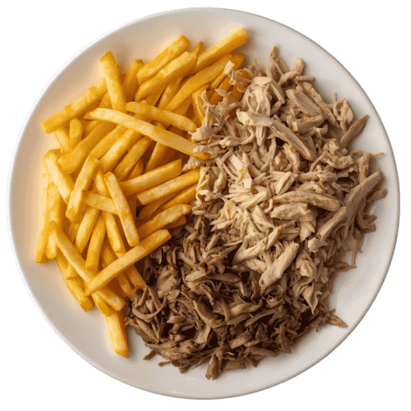 Schotel met kipdöner, friet of rijst, basisgroenten*, jalapenos, pepers, augurk en saus naar keuze.
