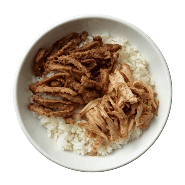 Schotel met döner gemaakt van rundergehakt, frietjes of rijst, basisgroenten* en saus naar keuze.